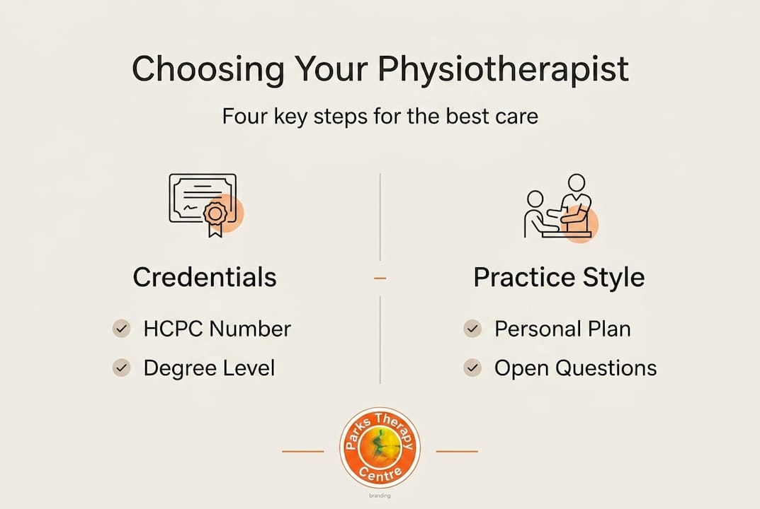 First: HCPC registration. The Health and Care Professions Council regulates physiotherapists in the UK. Any practising physiotherapist must be on the HCPC register. If they are not, they are not legally permitted to use the title "physiotherapist." You can search the public register online at any time. This is your non-negotiable baseline.