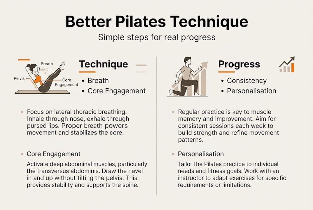 - Small technique errors can hinder progress in Pilates, but targeted adjustments based on core principles can improve strength and posture. Mastering breathing, core engagement, and avoiding common mistakes like shoulder shrugging or arching the lower back enhances effectiveness. Consistent, mindful practice with professional guidance fosters sustainable improvements and injury prevention.