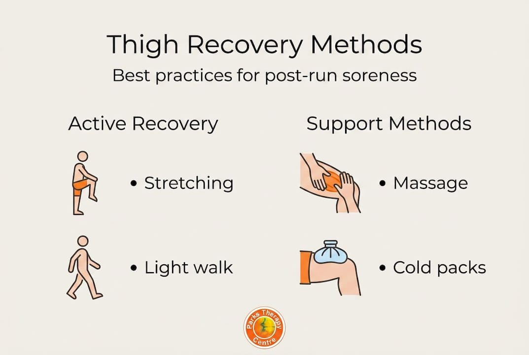 | Strength and gradual progress | Building thigh strength and increasing running volume slowly helps prevent future soreness. |