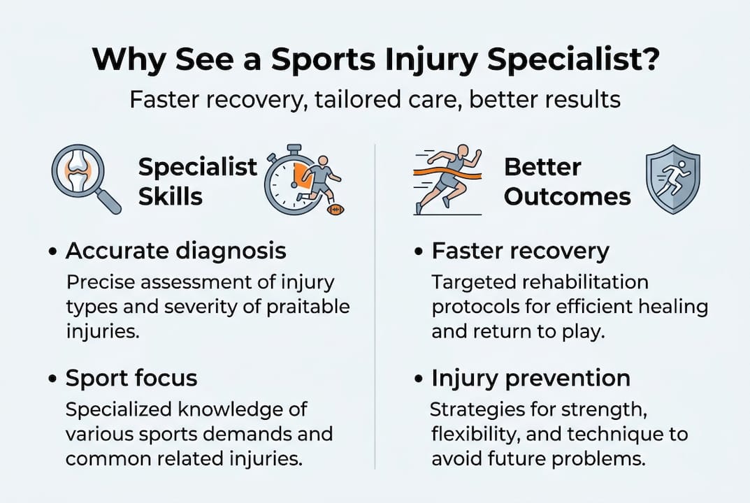 - Sports injury specialists provide faster, sport-specific diagnosis and tailored rehabilitation.