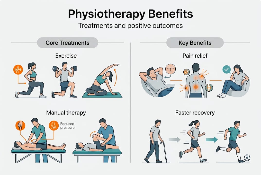 The evidence base for physiotherapy is substantial and continues to grow. Exercise and psychosocial interventions show moderate to strong evidence for reducing musculoskeletal pain and improving physical function. For chronic low back pain specifically, combining manual therapy with exercise produces meaningful short-term improvements in both pain and mobility.